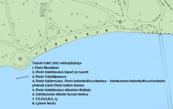 Taavin Tulet 2012-tapahtumassa tuliveistoksensa asettavat esille Porin taidekoulu, Lyseon koulu, T.E.H.D.A.S. ry, Porin Taiteilijaseura, Porin Nuokkari, Porin taidemuseo ja Porin lastenkulttuurikeskus – Satakunnan lastenkulttuuriverkosto yhdessä Länsi-Porin lukion kanssa sekä Satakunnan Elävän Kuvan Keskus ry. Tapahtuman videotaltioinnista vastaavat Porin Videotuki yhteistyössä Satakunnan ammattikorkeakoulun kanssa sekä Satakunnan Elävän Kuvan Keskus. Kulttuuritalo Annankatu 6 vastaa järjestyksenvalvonnasta. Ravintola Barco on auki tapahtuman aikana.